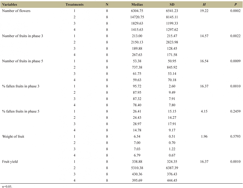 | Table 1: Summary of variance analysis for reproductive descriptors of camu-camu by Kruskal-Wallis test. [Click here to view] |