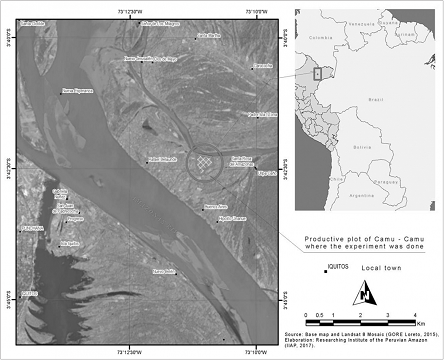 The present research was carried out in the community of Santa Rosa, Amazon River, district of Belen, between coordinates 03°42′24.0″ South Latitude and 73°11′01.5″ West Longitude. The area is located within a complex of banks of the Amazon river (Figure 1) characterized by dykes and physiographic depressions vernacularly known as “restinga” and “bajiales.” The banks are subject to a process of lateral erosion and are formed from the sediments carried by river waters during the flood.