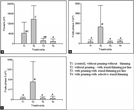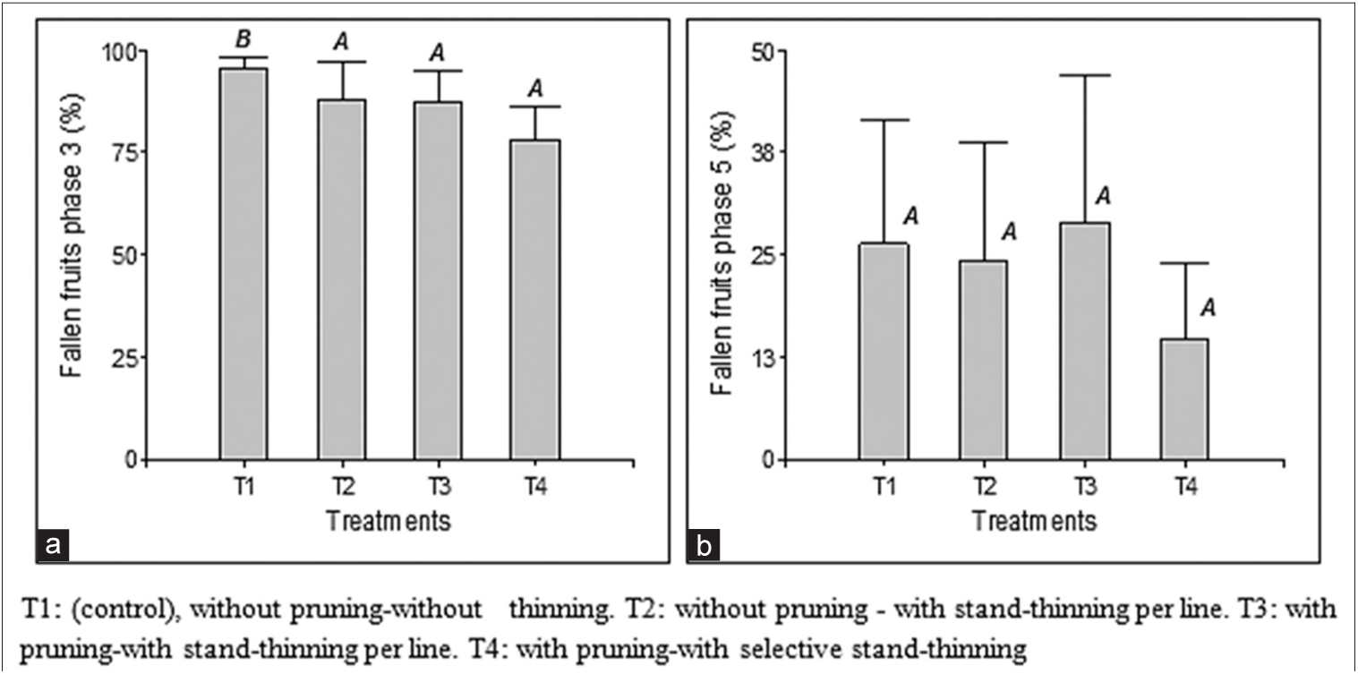 In Table 1, the Kruskal-Wallis analysis of variance shows highly significant differences between treatments (P < 0.05), with the effect of pruning and stand-thinning on the percentage of fruits falling to phase 3. The test of medians speared one group (treatments T2, T3 and T4) indicating that they are statistically homogeneous, while T1 presented the highest percentage of fruit drop, differs statistically from the other treatments (Fig. 3a).