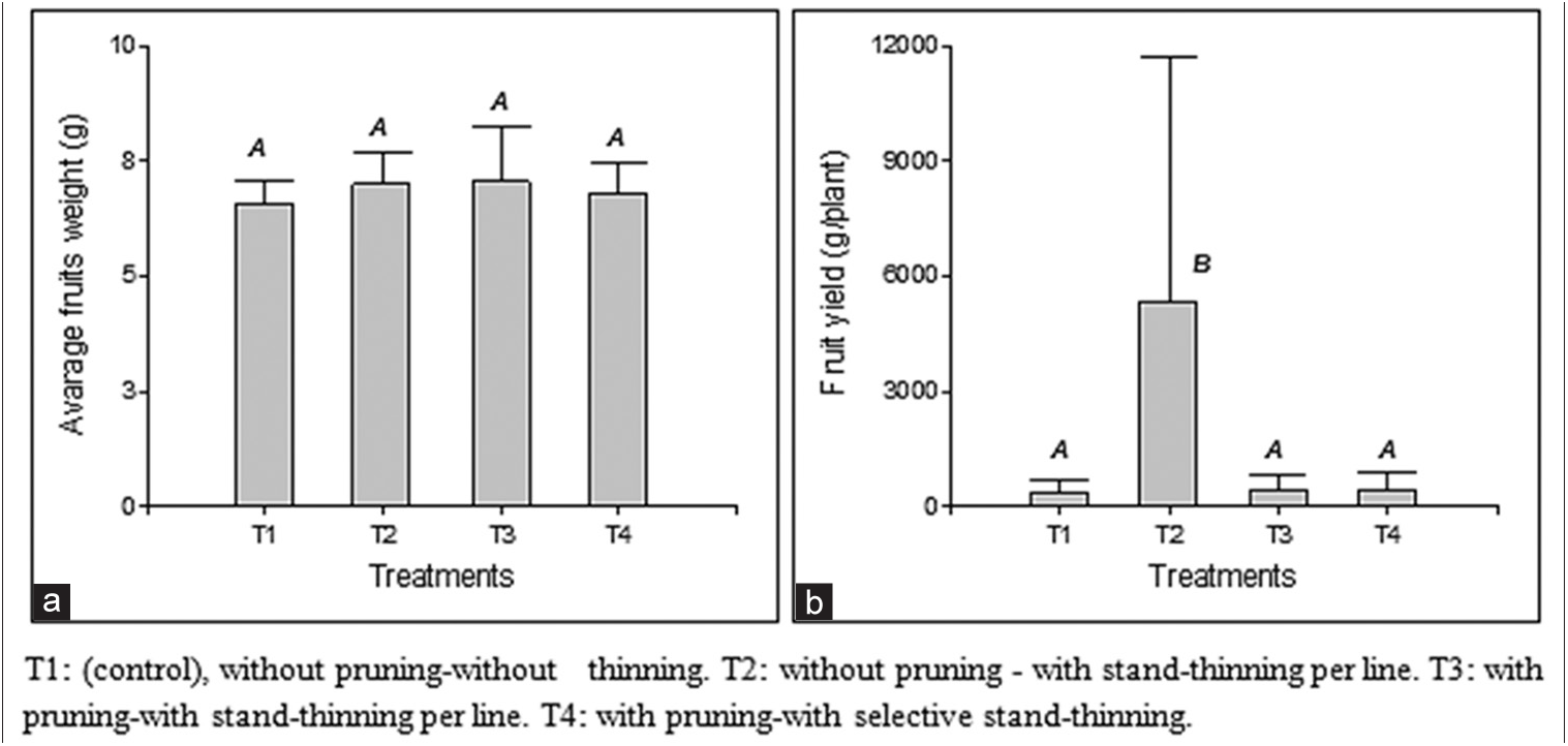 | Fig. 4: Effect of pruning and stand-thinning on the reproductive characteristics of camu-camu. (a) Average fruit weight where the same letters indicate that there is no significant statistical difference, (b) fruit yield (different letters indicate that there is significant statistical difference between treatments) (Table 1). [Click here to view] |