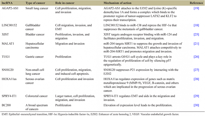 Table 1: The lncRNAs role and mechanism of action in various cancers.