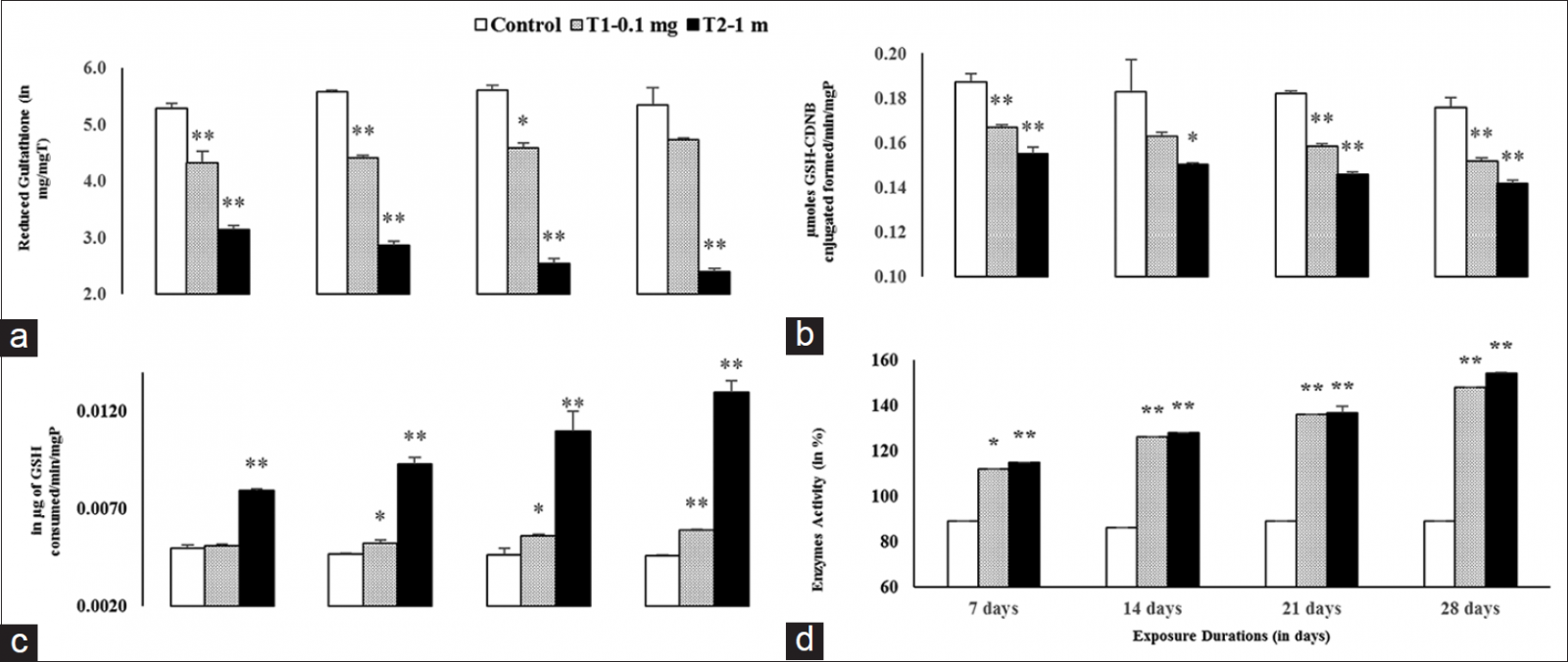 GSH levels were significantly declined after the exposure of 0.1 and 1 mg/kg/d dose of Aroclor 1254 for 7, 14, 21, and 28 days, except in 0.1 mg/kg/d dose of Aroclor 1254 exposure for 28 days [Figure 1a]. However, the GST activity was significantly increased after the exposure in 0.1 and 1 mg/kg/d Aroclor1254 for 7, 14, 21, and 28 days (P < 0.05 and P < 0.01) [Figure 1b]. On the other hand, the GPx activity in 0.1 mg/kg/d was increased with increasing exposure duration reaching the maximum after 14 and 21 days exposure (P < 0.05). This was followed by a significant increase in the GPx activity after 28 days exposure (P < 0.01) while, GPx activity in the 1 mg/kg/d group was significantly increased after 7, 14, 21, and 28 days of Aroclor 1254 exposure [Figure 1c]. SOD activity in the 0.1 and 1 mg/kg/d group was significantly increased after 7, 14, 21, and 28 days exposure of Aroclor 1254 (P < 0.05 and P < 0.01) [Figure 1d].