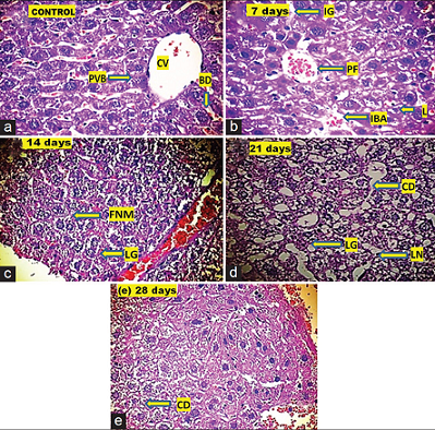 Figure 2: Photomicrographs (×400) of mice liver tissue from control and treated animals. The photomicrographs are showing the histopathological alterations in the liver of mice after the exposure of 0.1 mg/kg/ddose of Aroclor 1254 for 7, 14, 21, and 28 days as a compared control. (a) Control revealed the normal liver parenchyma with central vein (CV), portal vein branch (PVB), bile duct (BD); (b) after 7 days exposure: Lesions (L), Intravascular blood corpuscles accumulation (IBA), interstitial gap between two adjacent cells (IG), and portal fibrosis (PF); (c) after 14 days exposure: Fragmentation of nuclear material (FNM) and lipid granulomas (LG); (d) after 21 days exposure: Cellular destruction (CD), lysis of nucleus (LN), and lipid granulomas (LG); and (e) after 28 days exposure: Cellular destruction (CD)