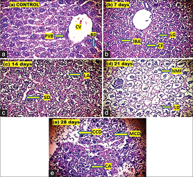 Figure 3: Photomicrographs (×400) of mice liver tissue from control and treated animals. The photomicrographs are showing the histopathological alterations in the liver of mice after the exposure of 1 mg/kg/ddose of Aroclor 1254 for 7, 14, 21, and 28 days as a compared control.(a) Control revealed the normal liver parenchyma with central vein (CV) and portal vein branch (PVB); (b) after 7 days exposure: Intravascular blood corpuscles accumulation (IBA), lipid granulomas (LG), and cellular fibrosis (CF); (c) after 14 days exposure: Nuclear fragmentation associated with intra- and inter-cellular lipid accumulation (LA), and sinusoidal degeneration (SD); (d) after 21 days exposure: Maximum lipid deposition (LD) and nuclear material fragmentation (NMF); and (e) after 28 days exposure: Massive cellular destruction (MCD), complete cellular destruction (CCD), and cellular aggregation (CA)