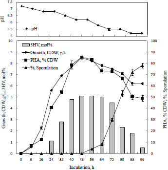 | Figure 1: Time course of growth, PHA production, sporulation, changes in pH of the medium and 3HV monomer incorporation in the copolymer produced by the endophytic isolate B. cereus RCL 02. [Click here to view] |