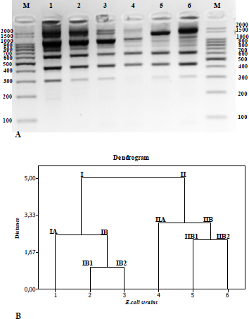Characterization of the genetic profile of Escherichia coli strains was performed using genomic DNA polymorphism analysis. Preserved ERIC-1 5’TGTAAGCTCCTGGGGATTAAC3’ and ERIC-2 5’AAGTAAGTGACTGGGGTGAGCG3‘ primers were used in PCR reaction for sequences of enterobacterial repetitive intergenic consensus described in the literature [11]. The reactions were carried out in a mix containing 2x Go taq Green Master Mix® (Promega, Corporation, USA), MgCl2 (2.5 mM), 10 μM of each primer and 50 ng of bacterial DNA in a final reaction volume of 50 μl. The amplification conditions were those described by Duan et al. (2009) [11]. The amplicons were visualized in 1.5% agarose gel stained with ethidium bromide and photo documented. The analysis of the amplification profiles was performed visually by two observers and transformed into binary data in a matrix, according to the presence (1) or absence (0) of bands. In order to evaluate the genetic relationship among Escherichia coli strains, the matrix was subjected to multivariate statistical analysis “Cluster Analysis” through the complete linkage method to calculate the Euclidean distance and generate a dendrogram using statistical software Minitab v. 1.6.