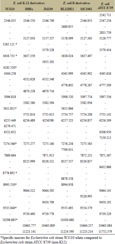 | Table 2: Observed masses generated from the peaks obtained by MALDI TOF analysis for Escherichia coli strains derived from K-12, Escherichia coli derived from B cells and Escherichia coli ATCC8739. [Click here to view] |