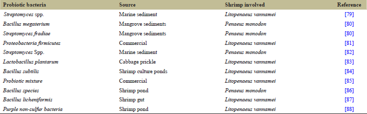 ![]() | Table 5: Probiotic bacteria used in shrimp aquaculture [Click here to view] |