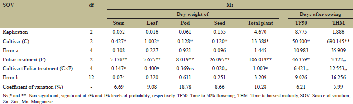 ![]() | Table 4: Analysis of variance for the impact of Zn and Mn sulfate on [Zn]leaf and seed, [Mn]leaf and seed, and seed protein content [Click here to view] |