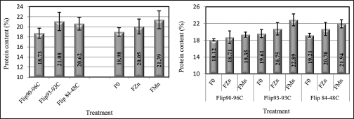 The results of analysis of variance of Zn and Mn concentrations in leaves and seeds as well as protein content in chickpea seed are shown in Table 6. According to the results, there was no significant difference between different cultivars in terms of Zn concentration in leaf and seed and Mn concentrations in chickpea leaves, while Mn concentration and protein content in chickpea grain were significantly different at 1% level (P < 0.01). In contrast, different spraying treatments caused a significant difference at 1% level in all traits studied in Table 6. The interaction effect of cultivar with Zn and Mn fertilizations (F × C) was not affected by Zn concentration in leaves and seeds, Mn concentration in leaves and seeds, and protein content of chickpea seed. The results of the comparison of means [Table 7] show that although the Zn concentration in the leaves and seed of chickpea cultivars had no significant difference, the highest Zn concentrations in leaves and seeds were observed in Flip 93–93C (129.86 mg/g) and Flip 84–48C (40.10 mg/g), respectively. In addition, the highest concentrations of Mn in leaves and seeds were recorded in Flip 84–48C (24.19 mg/g) and Flip 93–93C (30.90 mg/g), respectively. As expected, the use of Zn and Mn elements led to a sharp increase in the concentration of these elements in the leaves and seeds of the plant so that the highest Zn concentrations in the leaf (42.75 mg/g) and grain (72.21 mg/g) of chickpea were observed in Zn spraying, and the highest concentration of Mn in the leaves (39.09 mg/g) and grain (40.65 mg/g) was recorded in Mn spraying. Balai and Hidoto [38,39] studies showed that with Zn application, Zn concentrations in seeds and shoots of chickpea were increased. Interaction effects of cultivars and Zn and Mn spraying on Zn and Mn concentration in chickpea leaves and stems were not statistically significant, but according to Table 7, the highest Zn concentrations in leaf (48.25 mg/g) and grain (75.31 mg/g) in Flip 93–93C cultivar and the highest Mn concentration in leaf (42.65 mg/g) and seed (40.16 mg/g) were observed in Flip 84–48C and Flip 93–93C cultivars, respectively. Existence of sufficient amounts of nutrients in crop seed is one of the important factors in increasing the quality of crop production, which depends on the process of absorption and remobilization from other parts of the plant to the seeds [40,41]. There is a lot of difference between elements in terms of remobilization process so that some elements have little ability to retransfer from other organs to the grain [20]. In our experiment with Zn fertilization, Mn concentration in leaf and seed in all of the cultivars was increased. Furthermore, similar results were obtained with Mn spraying. Zn concentrations increased in leaves and grains by Mn spraying [Table 7]. There was a positive and significant correlation at 1% level between Zn concentration in leaf with dry weight of grain (r = 0.72**) and dry weight of total plant (r = 0.66**). Furthermore, there was a positive and significant correlation between Zn concentration in grain with dry weight of grain (r = 0.66**) and dry weight of total plant (r = 0.69**) [Table 2]. The highest and lowest protein content in chickpea seed were measured in Flip 93–93C (21.08%) and Flip 90–96C (18.73%), respectively [Figure 1]. On the other hand, Mn spraying had the greatest effect on the increase in protein content of chickpea seed compared to other treatments so that Mn spraying increased the protein content of chickpea seeds by 12.69% compared to the control treatment (non-spraying). Research conducted by Balai et al., and Choudhary et al. [38,42] showed that Zn intake could increase protein in chickpea seeds. They stated that Zn consumption as compared to non-intake treatment could increase the protein content of chickpea seed. According to Seguin and Zheng [43], the balance nutrition of the plant and the optimal use of chemical fertilizers can affect the amount of oil and protein in the crops. As can be shown in Figure 1, Mn spray had a great influence on the protein content of the Flip 93–93C variety (22.89%). In all cultivars, the least amount of protein belonged to the check treatment. In this experiment, increase in the amount of protein resulting from the Zn spraying in all three varieties was very low.