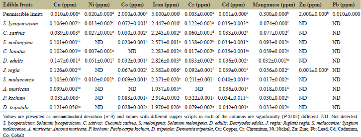 ![]() | Table 1: Heavy metals in fruits sold at Ubani Market in Umuahia, against their respective permissible limits in fruits [Click here to view] |