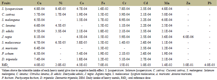 | Table 2: DIM from fruits sold in Ubani market Umuahia (mg/kg/day) [Click here to view] |