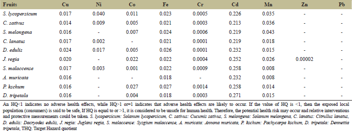 HQ for the locals (consumers) through the consumption of contaminated fruits were analyzed by finding the ratio of DIM to the oral RfD (for each metal). If the value of HQ is <1, then the exposed local population (consumers) is said to be safe if HQ is equal to or >1, it is considered unsafe for human health.