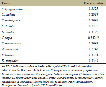![]() | Table 4: HI of heavy metals of fruits sold in Ubani market ‑ Umuahia [Click here to view] |