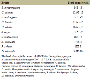 The cumulative cancer risk due to exposure to multiple sources of carcinogenic heavy metals through consumption of a particular type of fruit and was assumed, and the sum of the individual heavy metal increment risk was calculate following equation 5 [26].