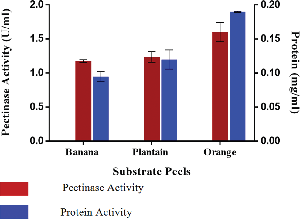 About 10 g of solid substrates, consisting of 99.7% (9.97 g) each of the powdered plant peels, 0.1% (0.01 g) (NH4)2SO4, 0.1% MgSO4, and 0.1% K2HPO4, were weighed into 250 ml Erlenmeyer’s flasks and then autoclaved at 121°C for 20 min. After cooling, 1 ml of the standard inoculum was introduced and the final moisture content adjusted to 70% using distilled water. The flasks were incubated for 14 days at 37°C. Following fermentation, 60 ml of citrate buffer (0.1 M, pH 5.0) was added to the flasks and stirred for 30 min under ice. The mixture was filtered and centrifuged at 12,000 rpm for 20 min. The resulting supernatant was tested for pectinase activity.