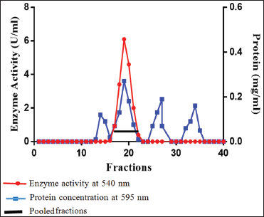 ![]() | Table 1: Summary of the purification process for Aspergillus fumigatus pectinase [Click here to view] |