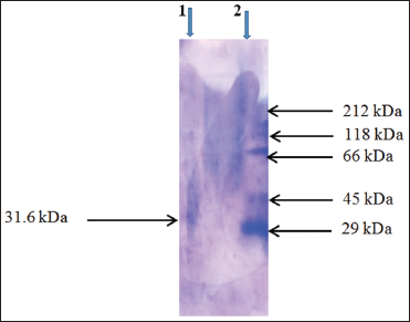 | Figure 6: Electropherogram of SDS-PAGE of Aspergillus fumigatus pectinase. Lane 1 is A. fumigatus pectinase while Lane 2 is the molecular weight ladder [Click here to view] |