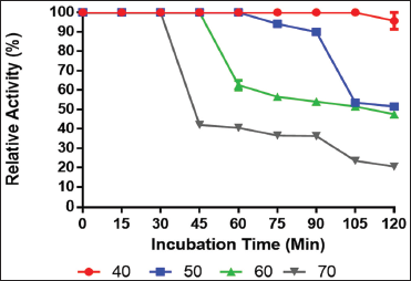 The enzyme was pre-incubated in a 0.1 M citrate buffer within a temperature range of 40–70°C. For a time span of 120 min at intervals of 15 min, aliquots of enzyme samples were withdrawn and the residual activity was determined.