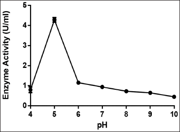 | Figure 9: Effect of pH on the pectinase activity of Aspergillus fumigatus activity [Click here to view] |