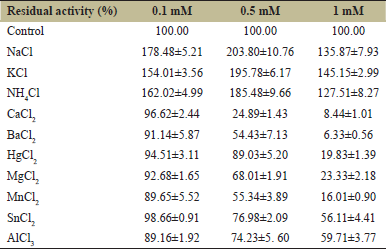 Influence of various salts at a different concentration on the enzyme activity was checked. The tested salts were NaCl, KCl, NH4Cl, SnCl2, CaCl2, BaCl2, MnCl2, MgCl2, and AlCl3. The enzyme was pre-incubated for 10 min at 60°C with the various salts, before the addition of pectin; then, the residual pectinase activity was evaluated. Assay mixture without salts was taken as control.