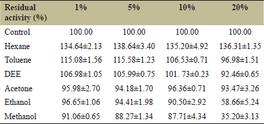 Pectinase assay was performed in the presence of 1%, 5%, 10%, and 20% of various organic solvents. The organic solvents used include hexane, methanol, ethanol, acetone, toluene, and diethyl ether (DEE). The enzyme activity was checked as previously described.