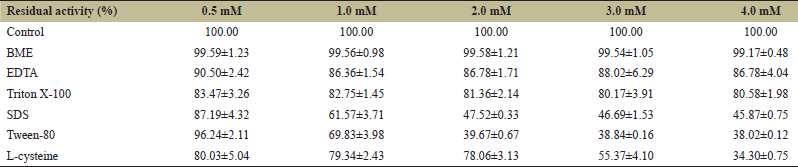 The effects of known enzyme inhibitors such as ethylenediaminetetraacetic acid (EDTA), beta-mercaptoethanol (BME), Triton X-100, sodium dodecyl sulfate (SDS) and Tween-80, and L-cysteine on the pectinase activity were studied. The enzyme was pre-incubated with 0.5 mM and 1.0 mM, 2.0 mM, 3.0 mM, and 4.0 mM of these inhibitors before the addition of substrate. Reactions in the absence of these inhibitors were used as the control with 100% enzyme activity. All chemicals were solubilized in distilled water.