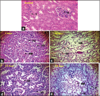 ![]() | Figure 2: Photomicrographs (×100) showed the histopathological alterations in the kidney of mice after the exposure of 1 mg/kg/day dose of Aroclor 1254 for 7, 14, 21, and 28 days as compared to the control. (a) Control: Normal kidney with tubule cells - TC, glomerulus - G. (b) 7 days: Variation in shape and size of TC, fragmentation of cytoplasm - FC, loss of nuclear material - NM. (c) 14 days: Variations in shape and size of TC, vascular congestion - VC, fragmentation of nuclear material - NM. (d) 21 days: Cytoplasmic fragmentation - CF, vacuolization of tubules cell - VT. (e) 28 days: Atrophy - A, tubules necrosis - N, fragmentation of nuclear material - NM [Click here to view] |