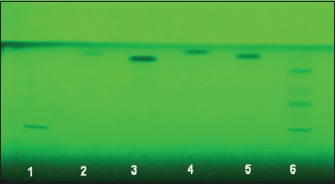 | Figure 4: Chromatogram obtained from standards (1: Rutin, 2: Quercetin, 3: Myricetin, 4: Kaempferol, 5: Silymarin, and sample 6: Ethyl acetate F.). Visualization was under UV light of wavelength 366 nm [Click here to view] |