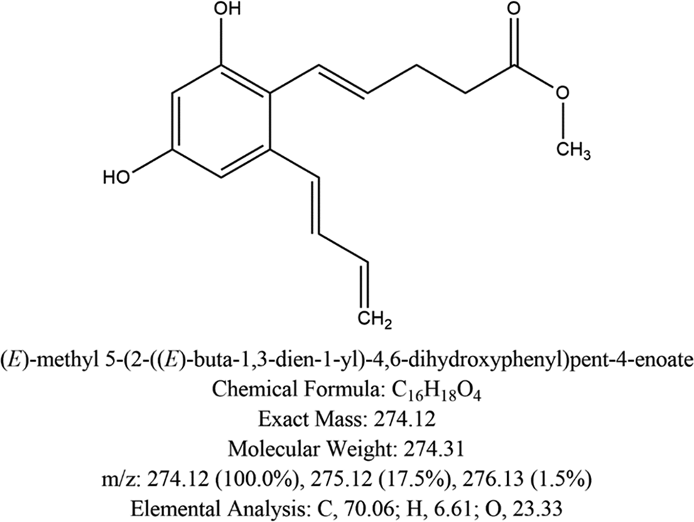 ![]() | Figure 2: Structure of compound SC2: Methyl (4E)-5-{2-[(1E)-buta-1,3-dien-1-yl]-4,6-dihydroxyphenyl} pent-4-enoate [Click here to view] |