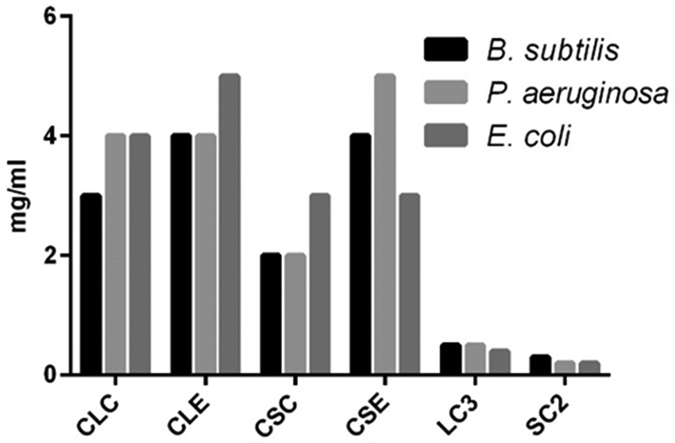 The extracts, CSC, showed inhibition at 2 mg/mL and 2 mg/mL for B. subtilis and P. aeruginosa, respectively. The CSC and CSE showed inhibition at 3 mg/mL for E. coli. Among phytocomponents, SC2 showed inhibition at 0.3 mg/mL, 0.2 mg/mL, and 0.2 mg/mL for B. subtilis, P. aeruginosa, and E. coli, respectively. The MIC values of all extracts and the isolated constituents are represented in Figure 4.
