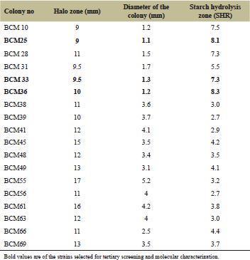 The halo zone formation and SHR led to selection of 18 bacterial strains (BCM10, 25, 28, 31, 33, 36, 38, 39, 41, 45, 48, 49, 55, 56, 61, 63, 66, and 69) for secondary screening (Table 1).