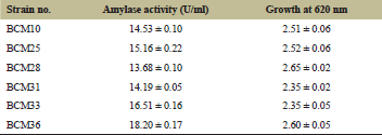 In secondary screening of the strains (Table 2), BCM36 showed highest activity (18.20 ± 0.17 U/ml) followed by BCM 33 (16.51 ± 0.16 U/ml) and BCM 25 (15.16 ± 0.22 U/ml). Lowest activity was found in BCM56 (9.62 ± 0.13 U/ml). Based on secondary screening, six amylolytic bacterial strains, namely, BCM10, 25, 28, 31, 33, and 36 were selected for further investigations.