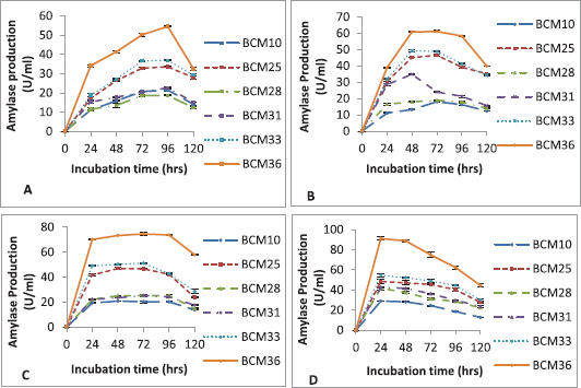 ![]() | Figure 1: Amylase production in different fermentation media; FMI (A), FMII (B), FMIII (C), and FM IV (D). Erlenmeyer flasks were incubated at 37°C up to 120 hours. Amylase production was assayed after every 24 hours. The graph depicts results of triplicate experiments (Mean ± SE). ANOVA was performed with p-value ≤ 0.05 considered significant. [Click here to view] |