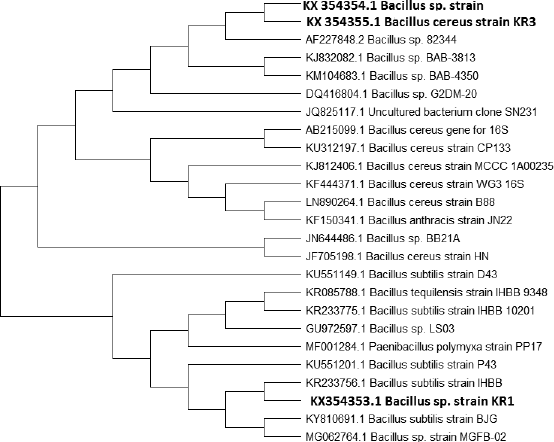 | Figure 2: Phylogenetic tree of strains KR1, KR2, and KR3 based on the neighbor-joining method. [Click here to view] |