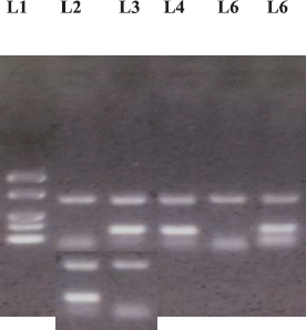 ![]() | Figure 1: Agarose gel electrophoresis for SSAP for HLA B-27. L1. Different base pair DNA ladder, L2. Positive Control, L3. Negative control, L4. Sample 1 and L6. Sample 3 Positive For HLA B-27, L5.Sample 2 Negative. [Click here to view] |