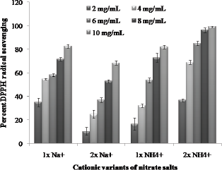 | Figure 3: Effect of cations and their concentration on the radical scavenging activity of C. emersonii KJ725233 (p value < 0.05).