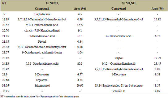 In order to confirm that the quantitative alterations observed in the antioxidant potential could be due to a corresponding occurrence of any such modifications in the antioxidant metabolites, the methanolic extracts of 1× Na+ and 2× NH4+ were subjected to GC-HRMS analysis. GC-HRMS analysis revealed qualitative, as well as quantitative alterations in the metabolites in response to the two cations (Table 3).