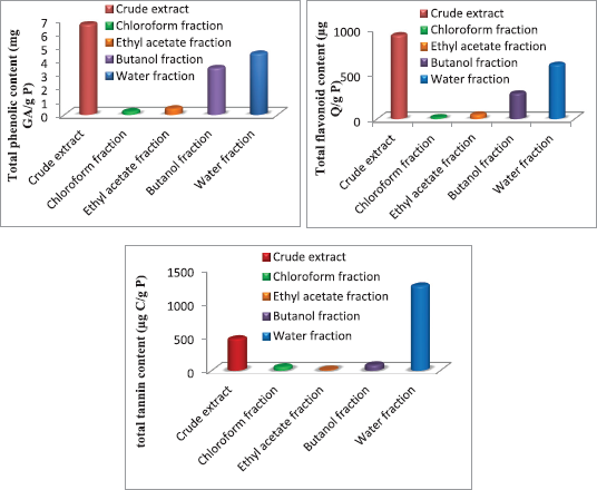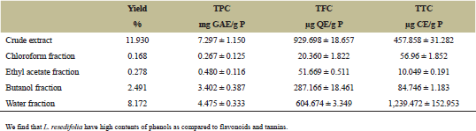 ![]() | Figure 1: Phytochemical contents of L. resedifolia’s extracts. [Click here to view] |