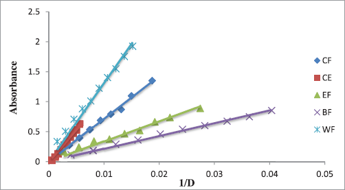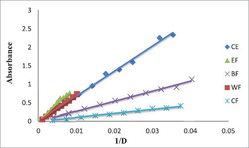 Figure 4 shows the total antioxidant capacity of L. resedifolia’s extracts expressed as absorbance in terms of the inverse of the dilution factor.