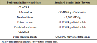 Class A digested sludge consist of chemically or biologically treated sludges that has a level of enterococci and thermotolerant coliforms per gram of dry matter below 1000 cfu/g and is without any detection of Salmonella spp. [23], according to the set standard of the 40 code of federal regulation part 503 biosolids rule (Table 1), established by United States Environmental Protection Agency. Class A products are suitable as fertilizer on lawns and gardens [23,24] and recommended for the application to agricultural land as it is assumed to be essentially pathogen-free [25]. In contrast, produced Class B digested sludge can contain an estimated fecal coliform density of over 1,000 cfu/g [26]. The use of Class B biosolids products are more restricted because they contain a detectable level of pathogens.