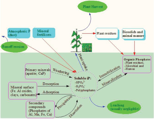 Phosphorus is an essential element and its availability contributes to controlling some aspects of global biogeochemical processes, such as soil genesis [94]. Phosphorus cycle in the soil are generally controlled by inorganic adsorption–desorption reactions, biologically controlled mobilization and immobilization by the microbial biomass, and the native P forms, principally, whether it is in an organic or inorganic form [95]. In natural ecosystems, phosphorus is usually a scarce resource and is efficiently being recycled; whereas, in agricultural systems, P is removed in crops or animal products. Figure 3 shows phosphorus cycling in soil [94].