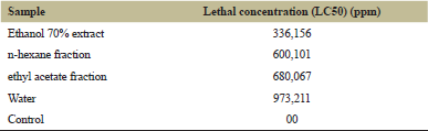 Based on the results of BSLT test (Table 1), it is noted that various concentration ethanol of extract, n-hexane fraction, ethyl acetate fraction, and water against concentration of larvae showed the different influence against death. Data in Table 1 show that the ethanol extract, n-hexane fraction, ethyl acetate fraction, and water are toxic against A. salina or less than 1,000 ppm, extracts that have the lowest LC50 value is ethanol extract (336.156 ppm) as compared with the other extracts. These data suggest that ethanol fraction extract can be potential as anticancer. The research of Priosoeryanto [15] also reported that an extract showing the activity of cytotoxic in the BSLT if the extracts can cause the death of 50% of the test animals at concentrations of less than 1,000 ppm.