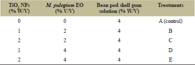 For preparation of the edible film, we modified the method of Perez-Cordoba et al. [13]. Bean pod shell gum solution was prepared at 4% w/v concentration, followed by adding 85% glycerol (Merck-Germany), and 99% polyethylene glycol (Biomedical-Netherlands) in ratios of 2% and 4% v/v, respectively. The plasticizer glycerol was added and mixed into bean pod shell gum solution using a magnetic stirrer at 95°C for 15 minutes. Then, the M. pulegium EO and TiO2 NPs (Sigma-Aldrich, Germany) were added at concentration of 2% and 4% v/v and 1% and 2% w/v, respectively. The plates including above treatments were taken in 37 incubators for 24–48 hours until drying the films. The treatments were repeated in triplicate and the sample without any NP and M. pulegium EO was considered as the control.