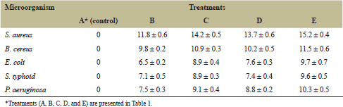 The treatments were set using randomized design in triplicate (Table 1). Data of antimicrobial activity were analyzed using excel 2016 software and results of inhibition zones reported by X ± SD. The differences between treatments were determined by analysis of variance and LSD tests at 95% using SPSS 2010 software.