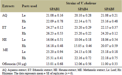 | Table 1: The inhibition zone diameter (mm) of leaf and rhizome extracts of M. arundinacea against different strains of V. cholerae. [Click here to view] |