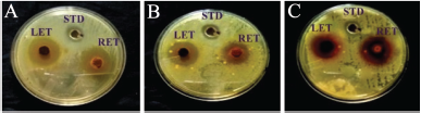 | Figure 2: Plate showing zone of inhibition against leaf and rhizome ethanolic extracts of M. arundinacea against different strains of Vibrio cholerae. (A) Vibrio cholerae strain SPAB1; (B) Vibrio cholerae strain SPAB4 and (C) Vibrio cholerae strain SPAB5. [Click here to view] |