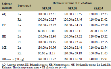 The MIC values of different solvent extracts of leaves and rhizomes are represented in Table 2, indicating that the variations are dependent not only as per the solvent system but also depend on the strains of V. cholerae. Among the various solvent extracts studied in this assay, ethanolic extract of rhizome exhibited the smallest inhibitory concentration (80.00 ± 10.06 µg/ ml, 90.00 ± 10.82, 100.00 ± 16.11) which indicates the maximum prevention power against SPAB1, SPAB5, and SPAB4, respectively. However, in the case of leaf samples, no such significant variations were observed.