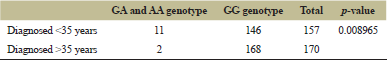Within 327 diabetic individuals, we subdivided the individuals into two age groups, i.e., <35 and >35. This was done based on DMT2 individual’s record of first time positively diagnosed for DMT2. Distribution of 308G>A SNP within these subgroups shows that 11 (nine heterozygous and two homozygous) individuals were under the age of 35, whereas only two individuals were within the over 35 age group (Table 3). Fisher’s t-test at the 95% confidence level provides a significant value of 0.008965 (Table 3). However, the independent analysis for either GA or AA genotype did not produce any significant difference at 95% confidence level.