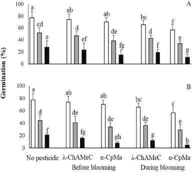 The results obtained in this study showed that pesticides inhibited in vitro germination of pollen. Control pollens had the best germination rates in vitro, followed by pollen from plants treated with systemic (λ-ChAMeC) or contact (α-CpMa) pesticides before flowering, and the last were pollens from watermelon plants treated during flowering. These results are consistent with those of authors who showed that the fungicides applied to pollens lead to a decrease in their in vitro germination, deformation and cracking of the pollen tubes [26,27]. Zarrabi and Imani [28] demonstrated that high pesticide application during flowering, induced modification of pollen’ morphological characters and significantly reduce pollen germination and pollen tube elongation of peach and nectarine. Therefore, the negative effects of fungicides on the in vitro germination of pollens are variable and depend on the type of pesticides used.